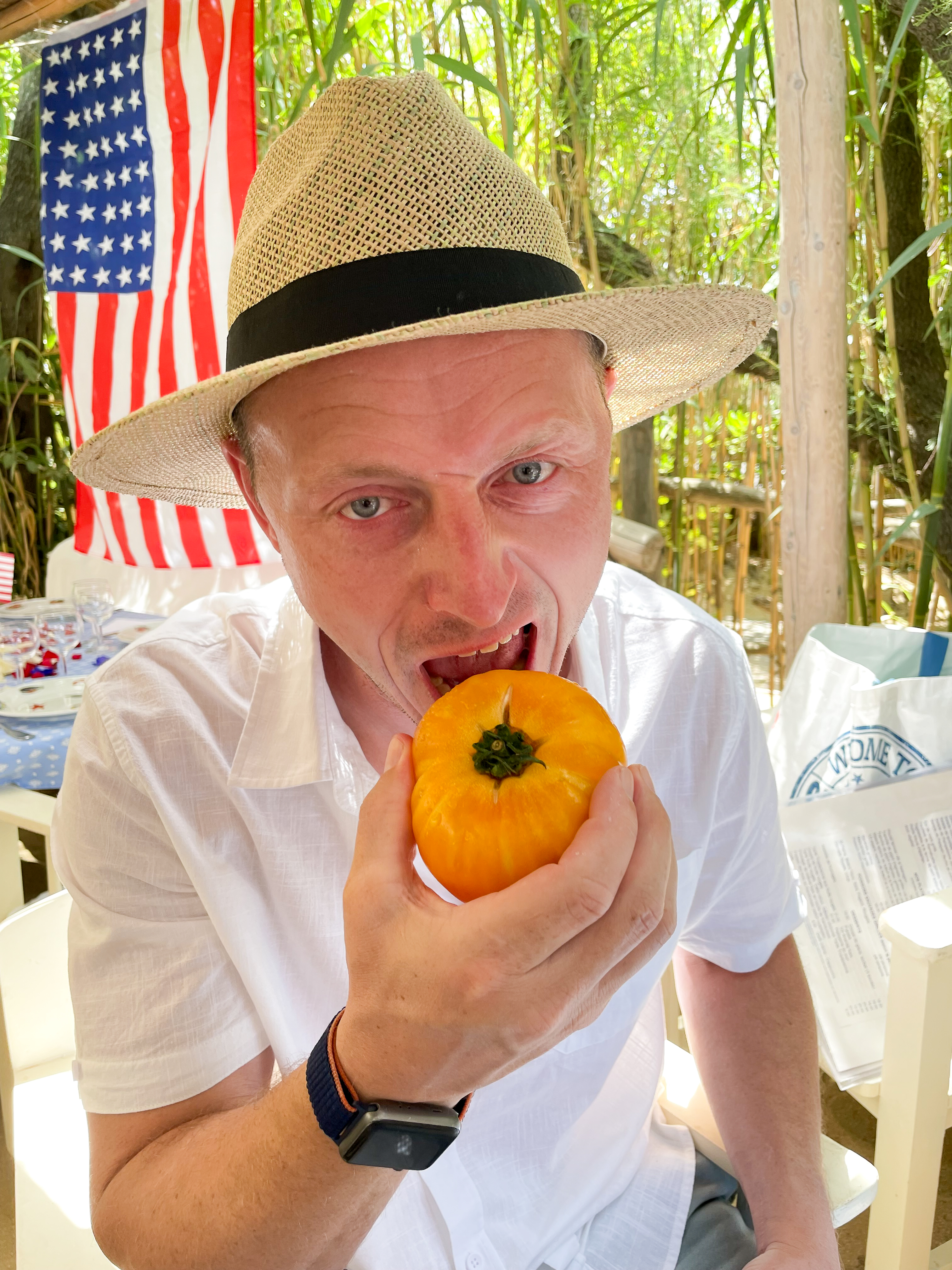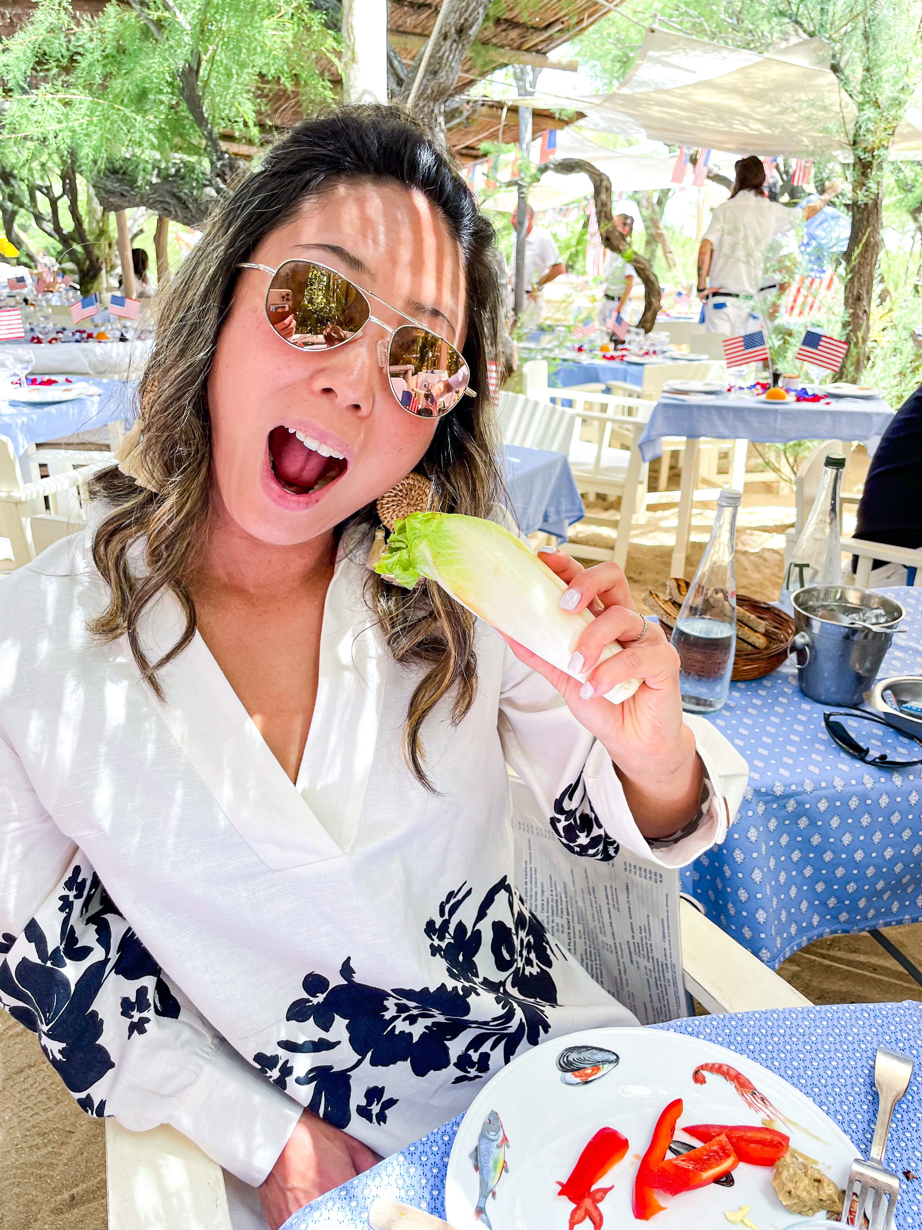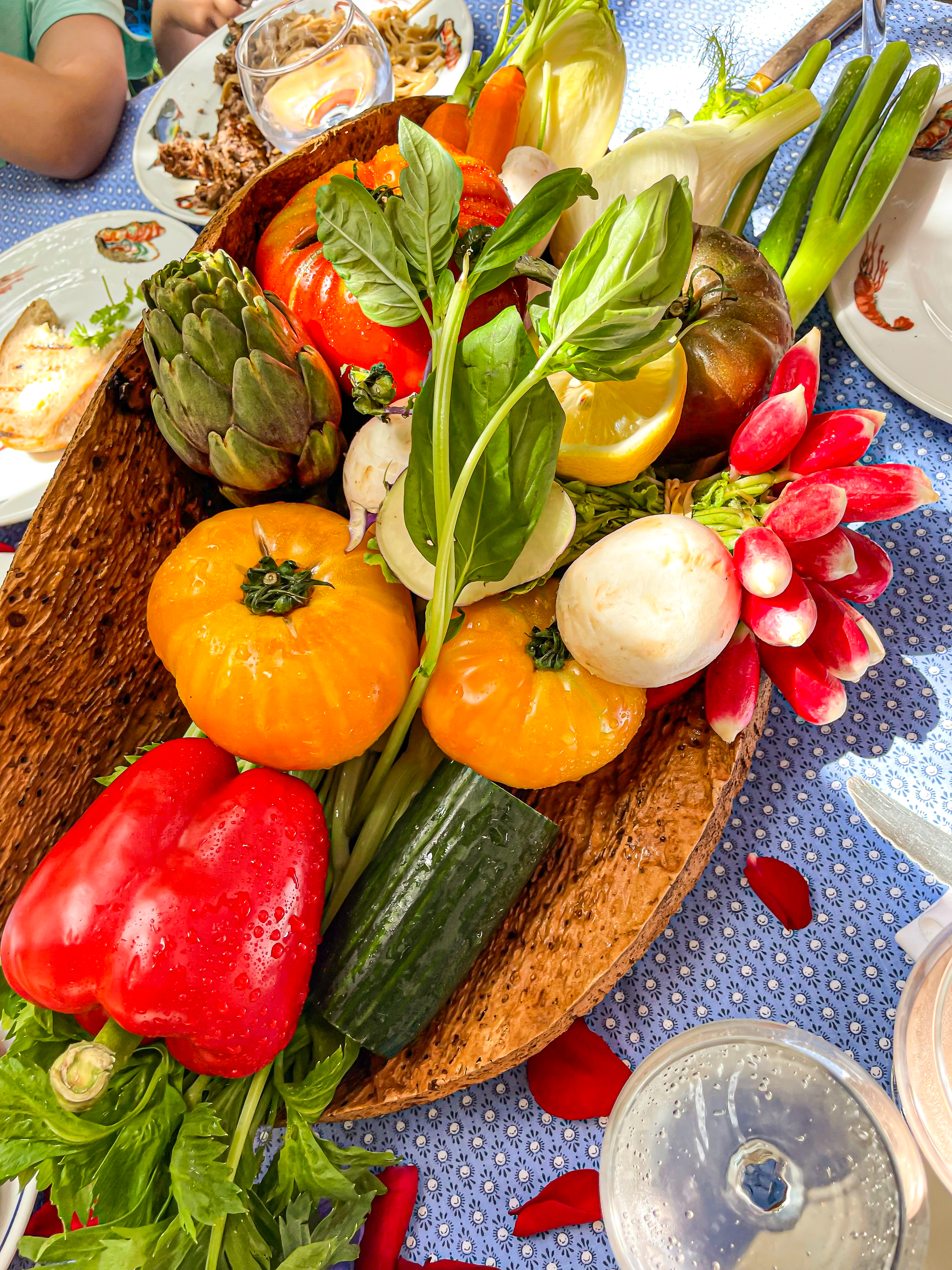 - Food: Don’t miss the legendary crudité platter with giant vegetables, grilled fish, and simple French classics. We happened to be there for 4th of July, and they really leaned in (as you can see).