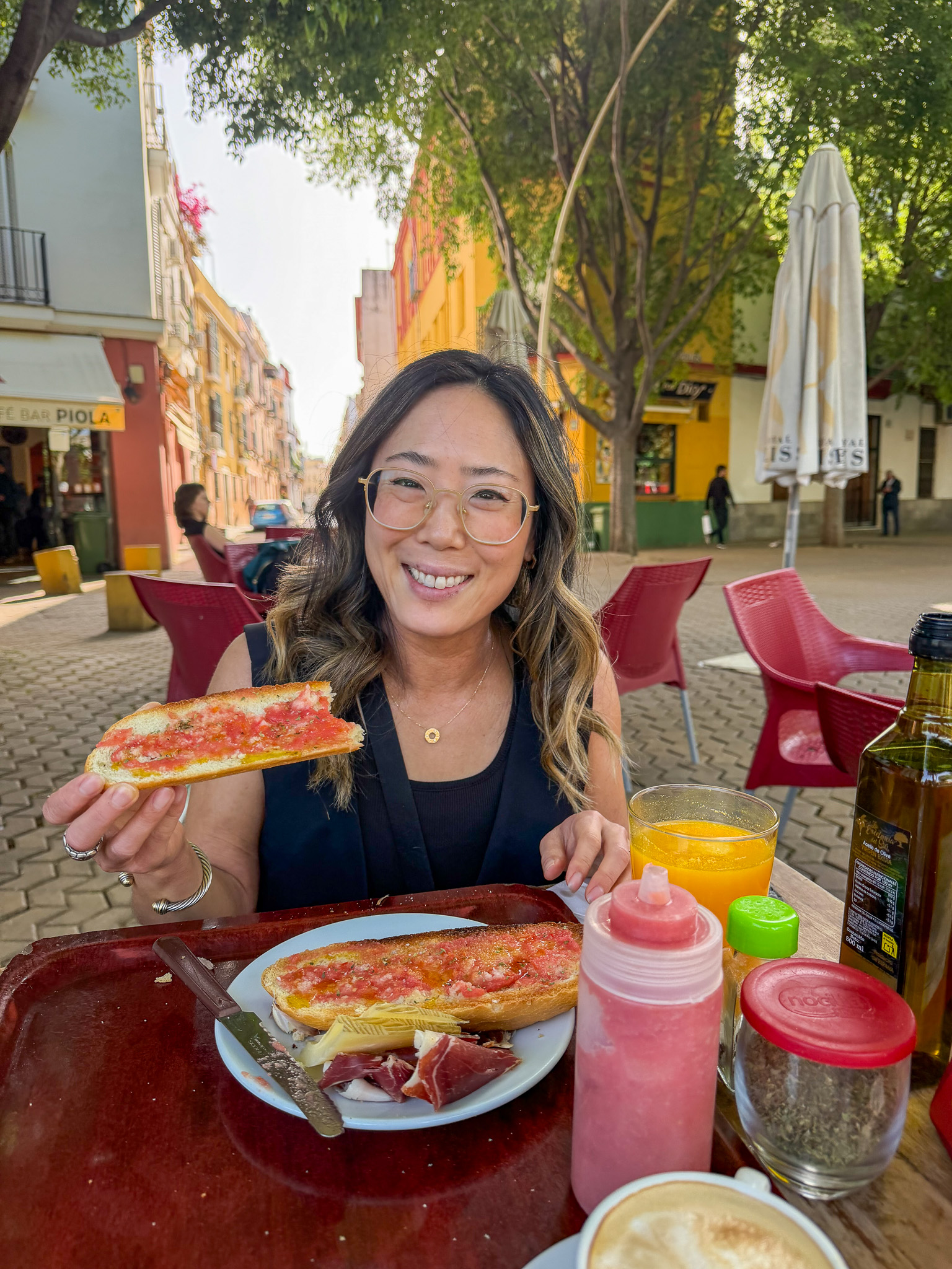 - Café Bar Piola — nice outdoor seating on the main walkway through Barrio Santa Cruz, with a fun DIY setup: choose your bread type and load your own toppings from the bar. We went classic — garlic, tomato, and olive oil. Relaxed pace, very local.