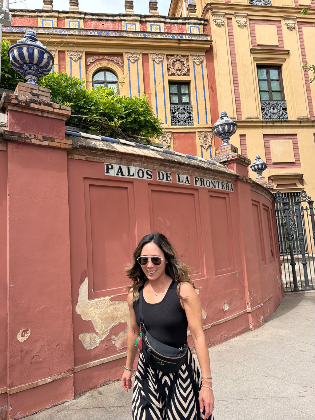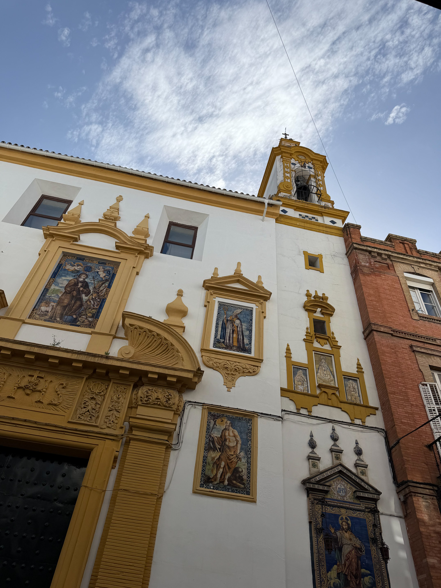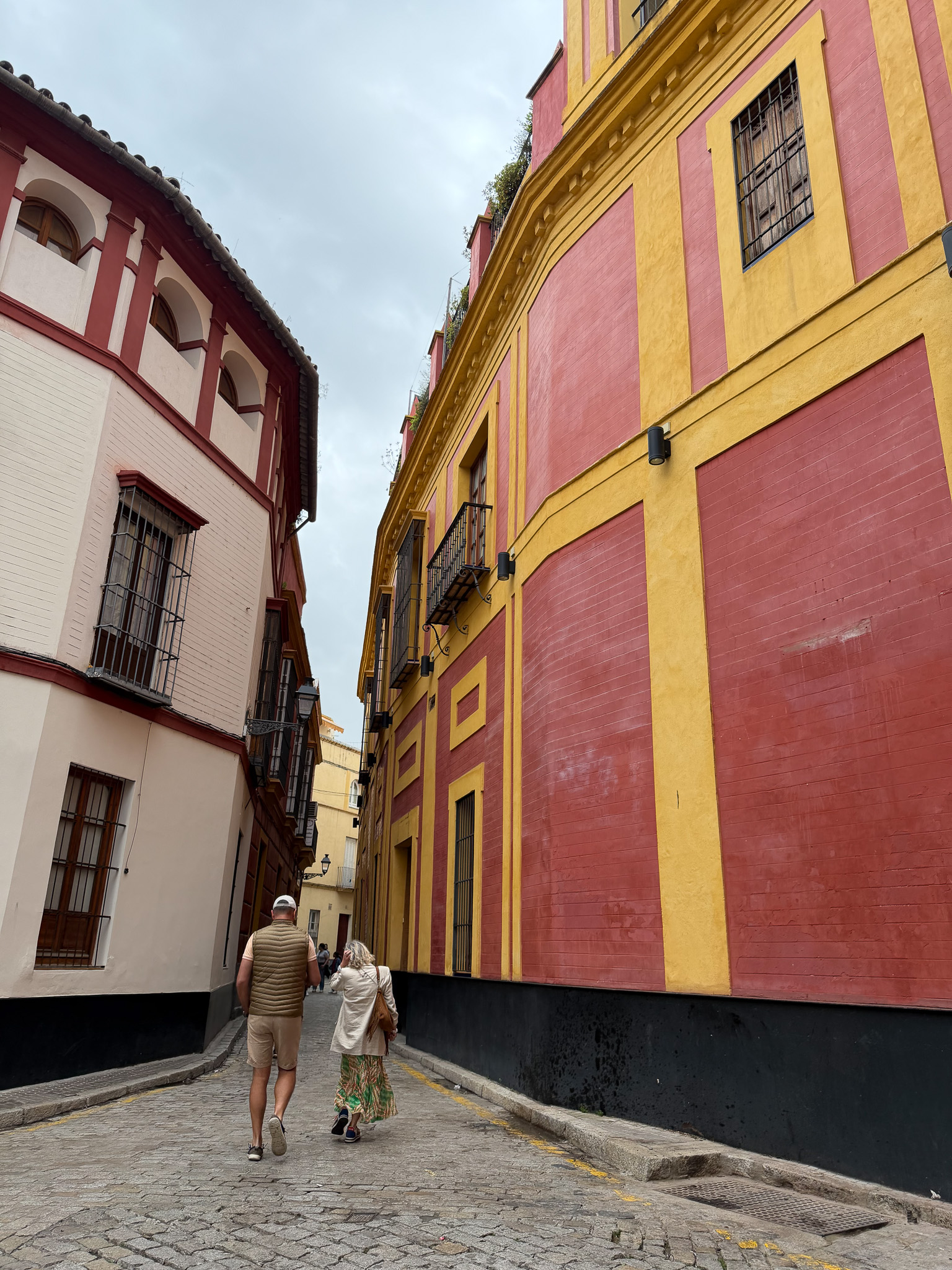 Seville is visually unlike anywhere else we’ve been. The color palette of the city is something you feel before you fully register it — warm orange-yellow buildings that seem to glow even on overcast days, deep coral and terracotta facades, and vivid blue-and-white azulejo tiles woven into the architecture everywhere you look. Frescoes, fountains, ornate ironwork. It’s layered and rich and very, very photogenic.