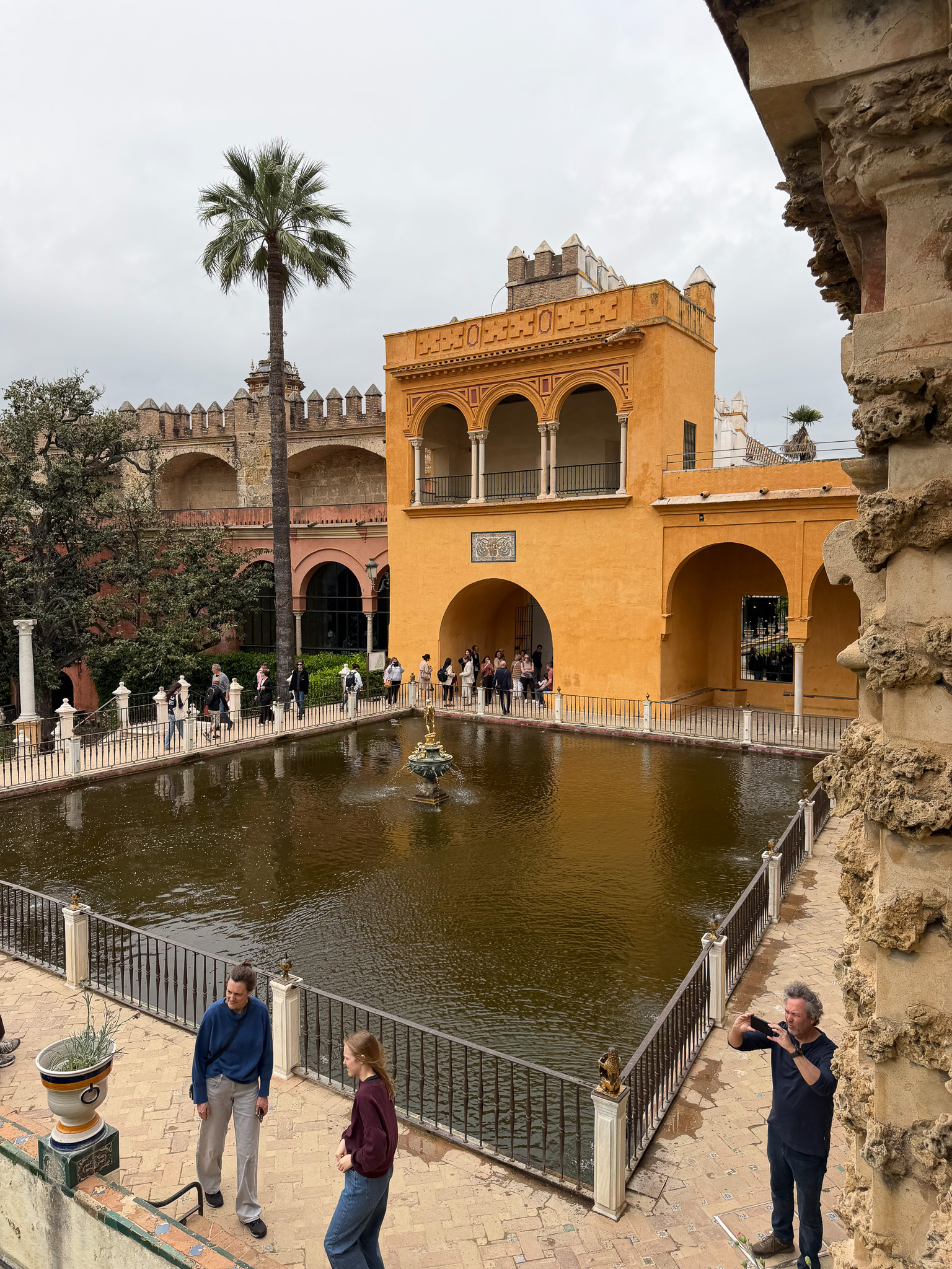 The undisputed highlight of the trip. The Royal Alcázar is a still-functioning royal palace and one of the finest examples of Mudéjar architecture anywhere in the world. Even under grey skies, the grounds were staggering — intricate tiled interiors, a garden maze, fountains at every turn, and ducks that very much own the place. The elevated gallery that wraps around part of the upper level gives you a beautiful view down over the gardens and courtyard below. It’s the kind of place you move through slowly and still feel like you missed things.